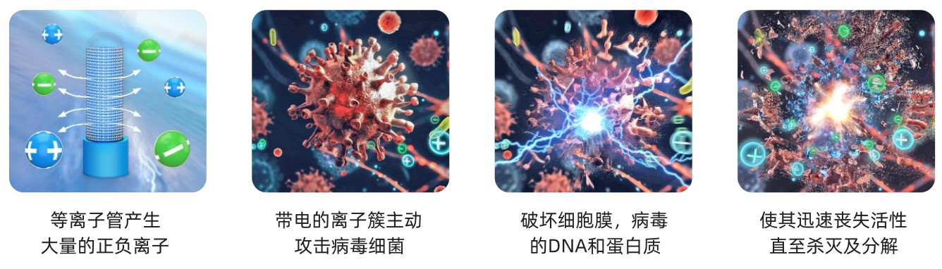 等离子空气(Plasma ions) 的电离系统,是运用特定电压原理进行工作,通过正负离子产生器的内/外电极(通过绝缘体使其相互分离)迫使放电触发,然后生成与自然界相近的离子簇。这些数百万计的带电的离子簇与空气中的细菌、病毒、等有害物质主动碰撞,击穿细胞膜、DNA和蛋白质,使其迅速破裂丧失活性,直至杀灭及分解,这种方式被称为空气电离技术。