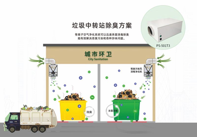 生活垃圾在堆放、装卸、转运过程中腐烂发臭,产生了带有强烈刺激性气味的氨、有机氨及部分的硫醇、甲烷等气体,对周围的居民生活有很大影响,而垃圾站除臭系统中应用的等离子空气消毒设备可以有效地减少H2S,TVOC,NH3,NO2等有害气体的含量,预防细菌滋生和疾病的传播。