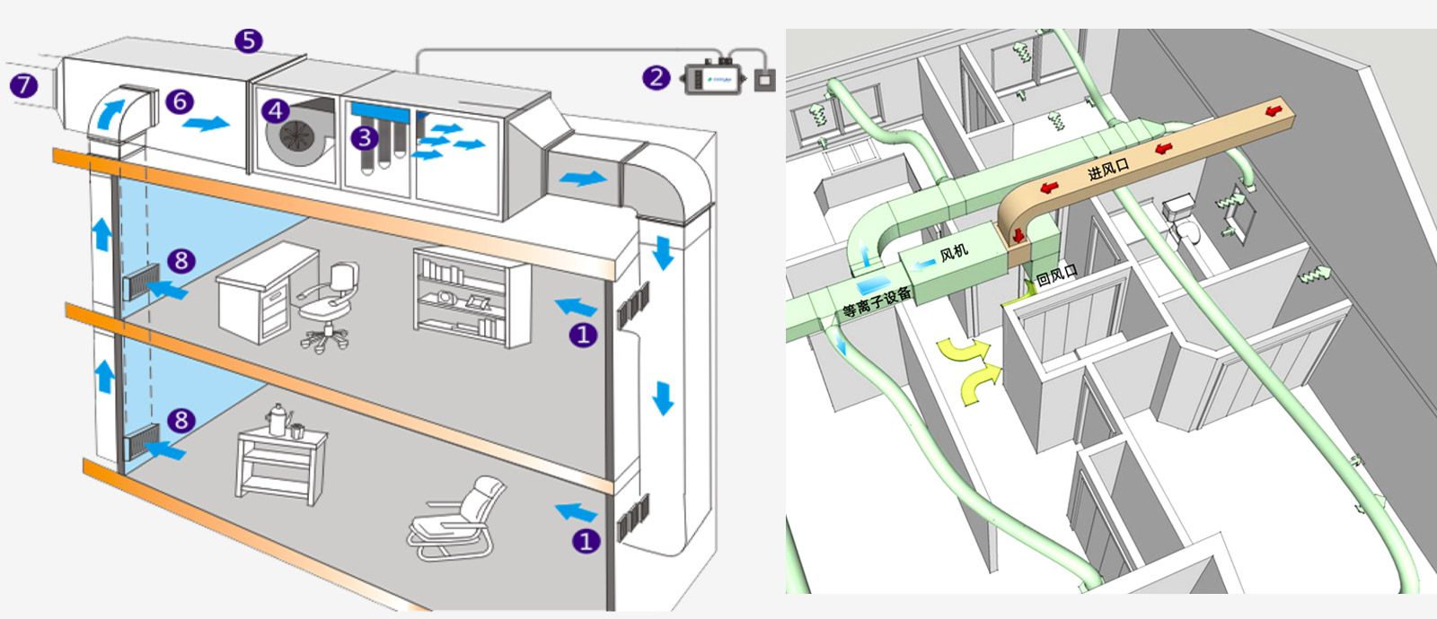 1.送风口 2.空气质量传感器 3.等离子空气系统 4.风机 5.排风 6.混风段 7.新风入口 8.回风口
